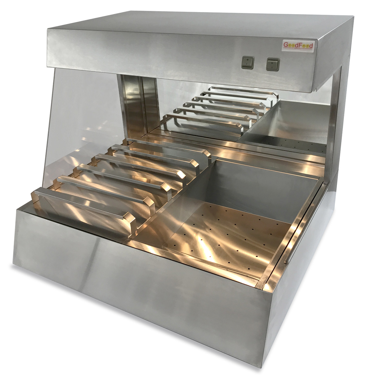 Апарат для підігріву GoodFood CW80S призначений для зберігання картоплі фрі та чіпсів у теплому стані, забезпечуючи їх апетитний вигляд і свіжість. Підігрів відбувається за рахунок розжарювальної лампи, що розташована зверху, забезпечуючи рівномірне нагрівання продуктів. Ліва сторона апарата призначена для викладки картоплі фрі в паперові пакети, а права — для зберігання насипом у спеціальній ємності. Вбудоване підсвічування покращує презентацію продуктів, а дзеркальна задня стінка створює візуальний ефект збільшення об'єму. Ліва сторона захищена оргсклом, що додає безпеки і гігієни. Корпус виготовлений із нержавіючої сталі, що забезпечує міцність і довговічність конструкції.